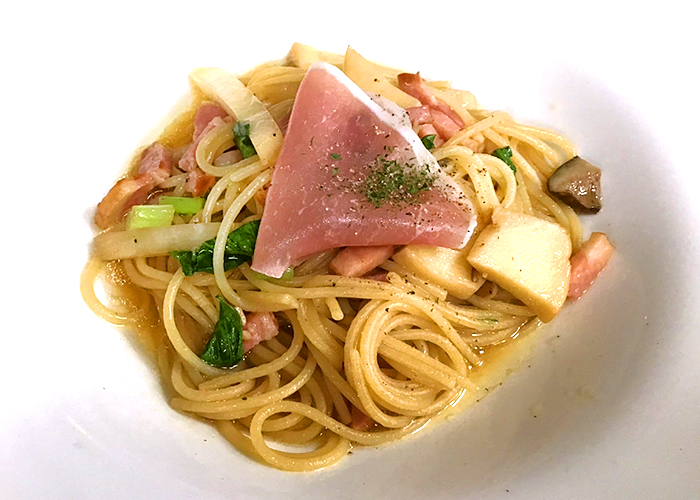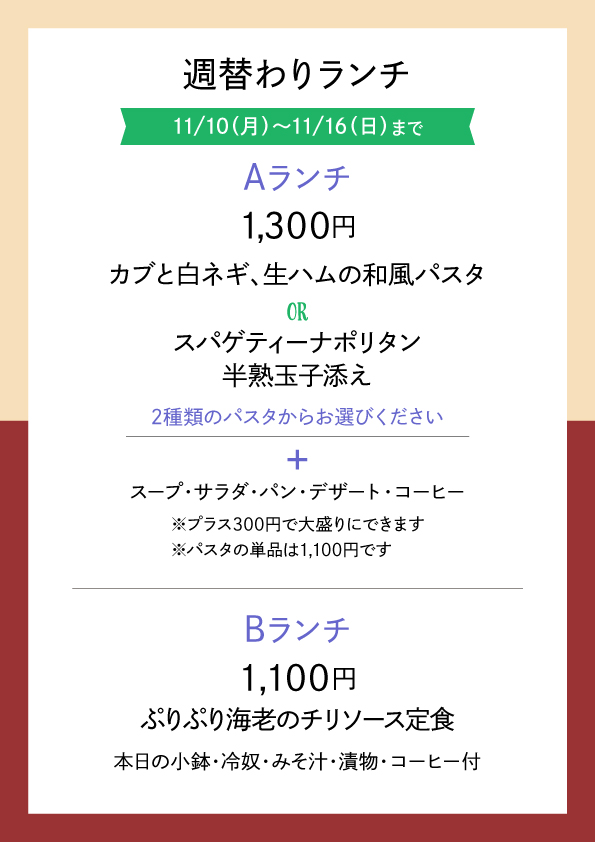 週替わりランチ 11/10(月)〜11/16(日) Aランチ カブと白ネギ、生ハムの和風パスタ or スパゲティーナポリタン 半熟玉子添え スープ、サラダ、パン、デザート、コーヒー プラス300円で大盛りにできます ※パスタの単品は1,100円です ★★★★★★★★★★★★★★★★★★★★ Bランチ ぷりぷり海老のチリソース定食 (本日の小鉢・冷奴・みそ汁・漬物・コーヒー付)