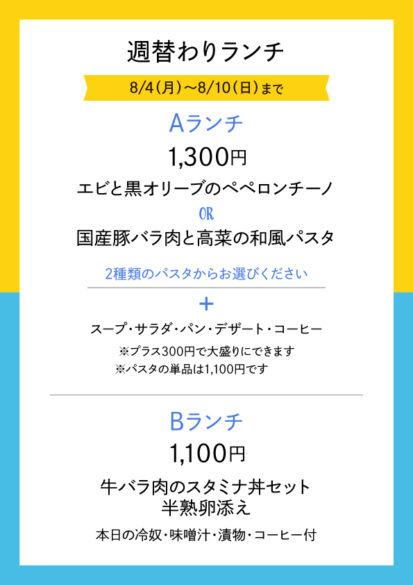 週替わりランチ 8/4(月)〜8/10(日) Aランチ エビと黒オリーブのペペロンチーノ or 国産豚バラ肉と高菜の和風パスタ スープ、サラダ、パン、デザート、コーヒー プラス300円で大盛りにできます ※パスタの単品は1,100円です ★★★★★★★★★★★★★★★★★★★★ Bランチ 牛バラ肉のスタミナ丼セット 半熟卵添え (本日の冷奴・味噌汁・漬物・コーヒー付)